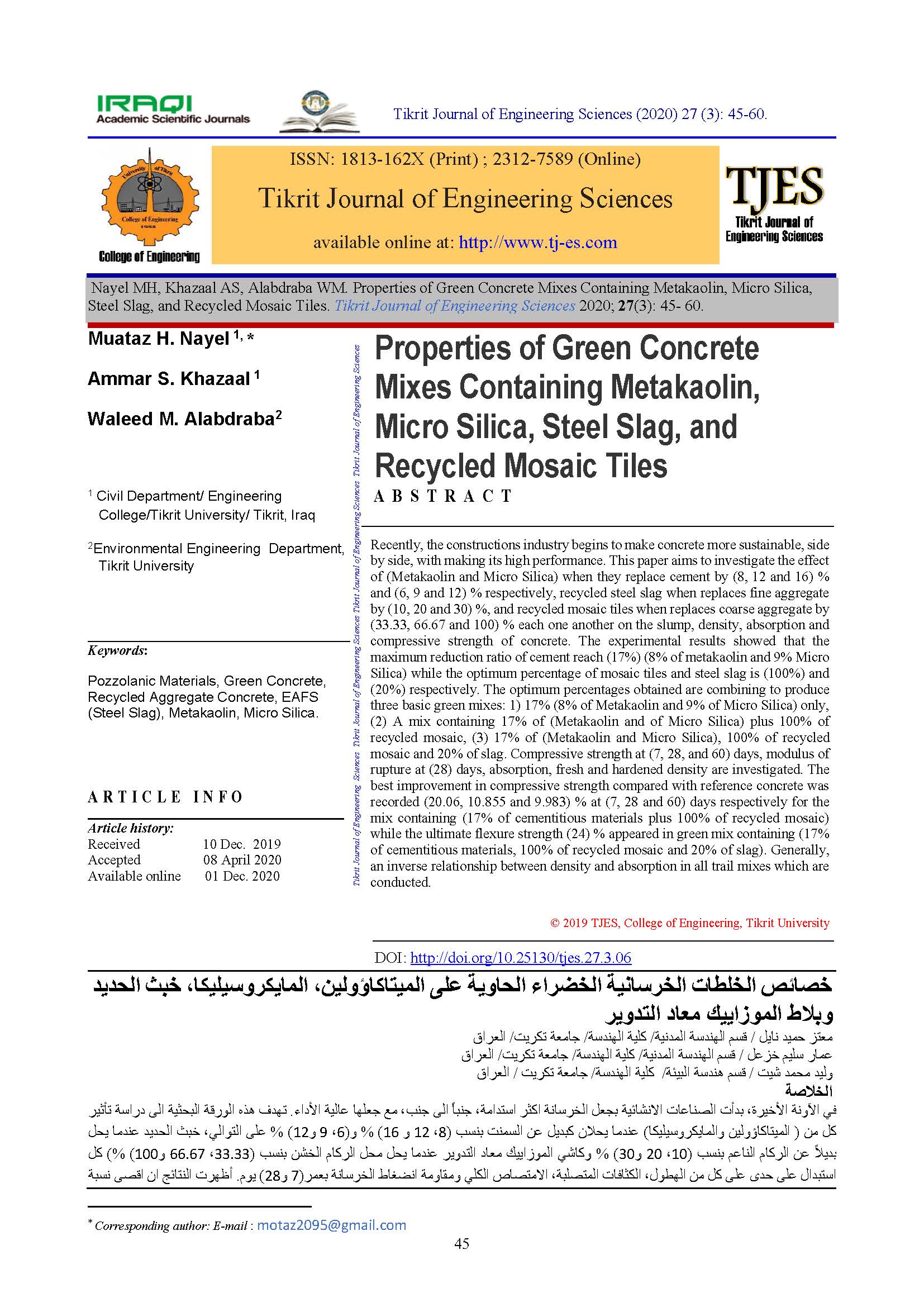 Jumaa’h MM, Kamil B, Baghabra OS. Mechanical and Structural Properties of a Lightweight Concrete with Different Types of Recycling Coarse Aggregate. Tikrit Journal of Engineering Sciences 2019; 26 (1): 33-40.