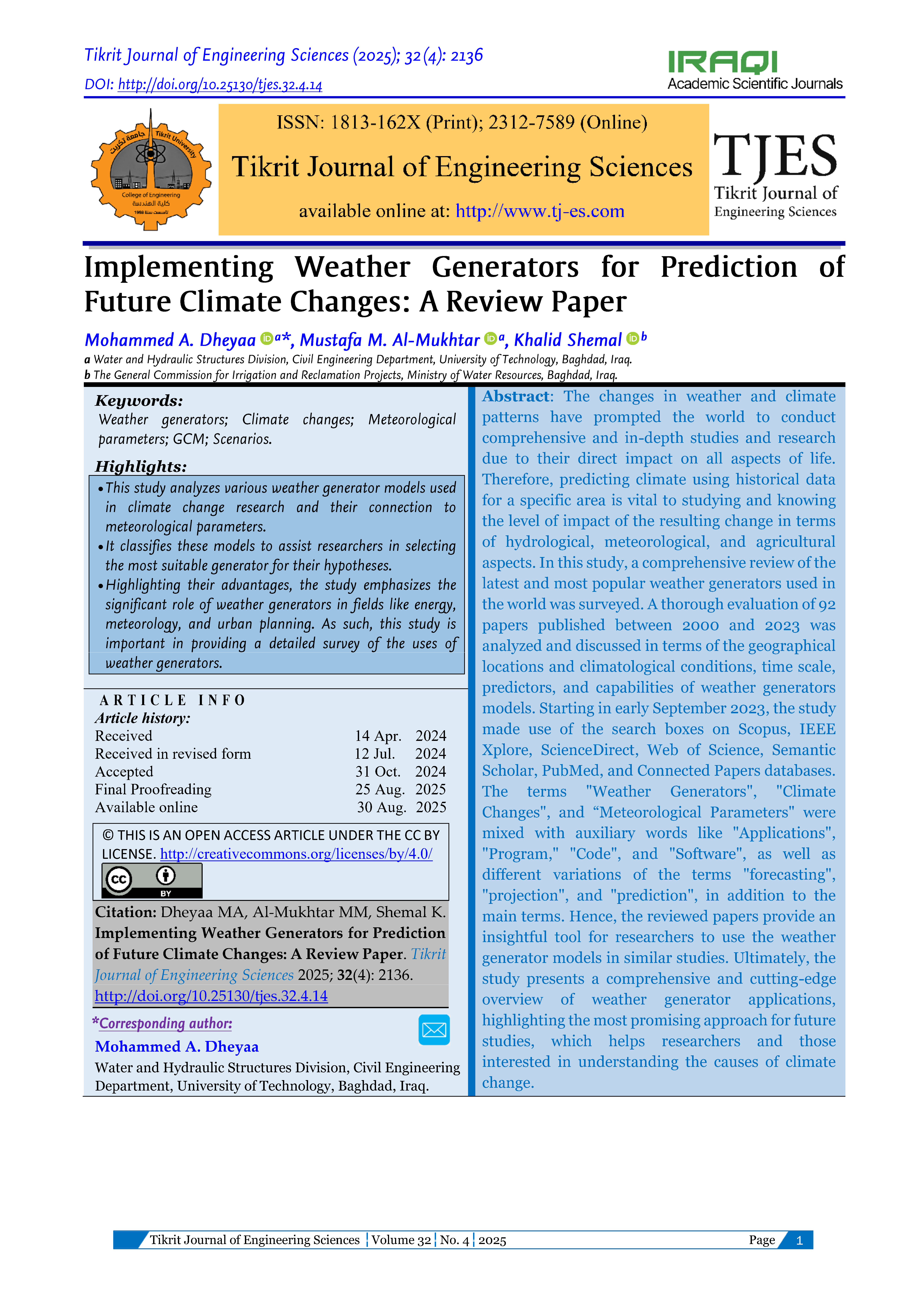 Doaa R. Mohammed RKM. Climate Change’s Impacts on Drought in Upper Zab Basin, Iraq: A Case Study. Tikrit Journal of Engineering Science 2024; 31(1): 161–171. DOI: https://doi.org/10.25130/tjes.31.1.14