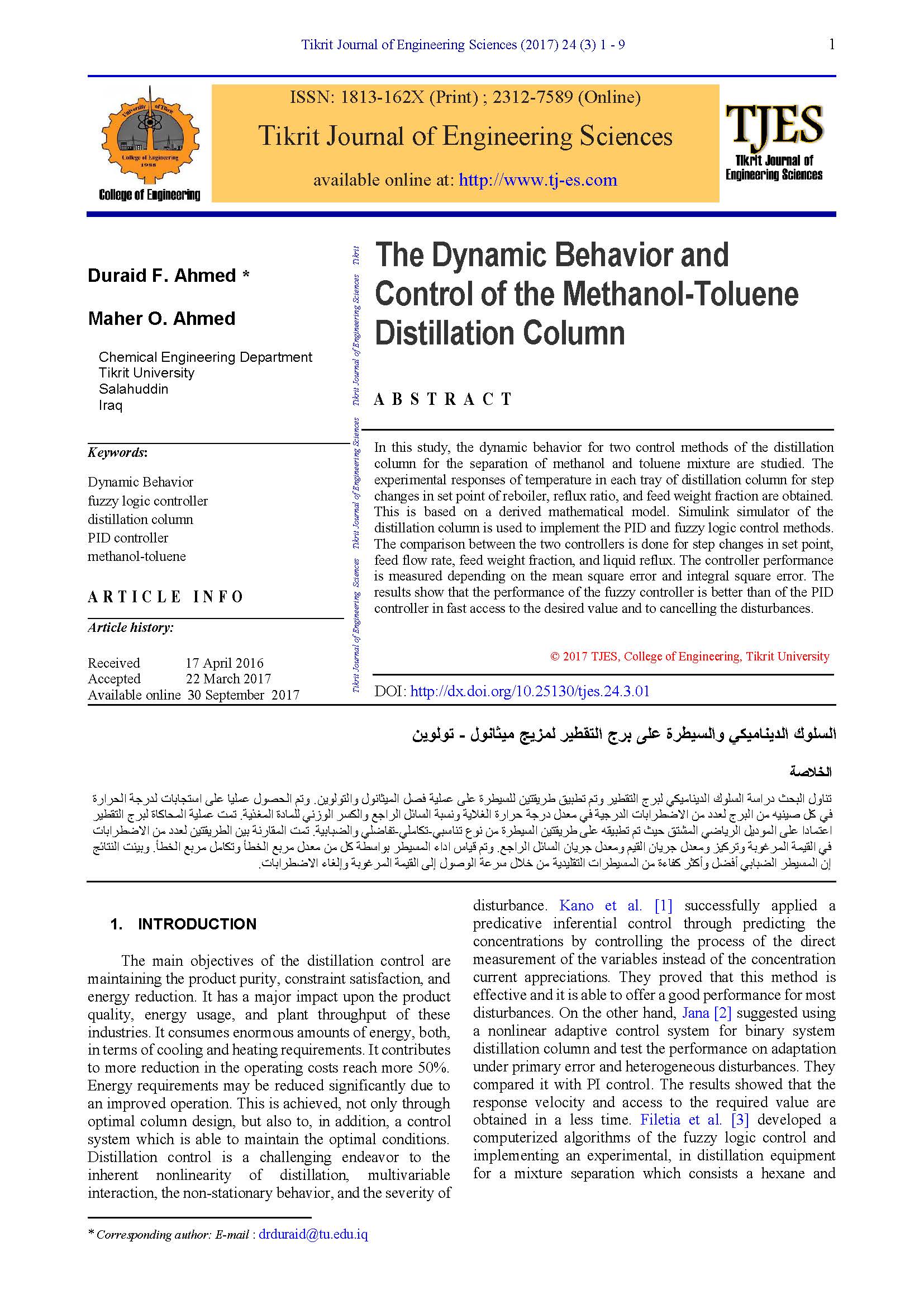 Duraid FA, Mohammed HK. Studying of the dynamic behaviour and control of continuous distillation column. Tikrit Journal of Engineering Science 2013; 20 (4): 95-110.