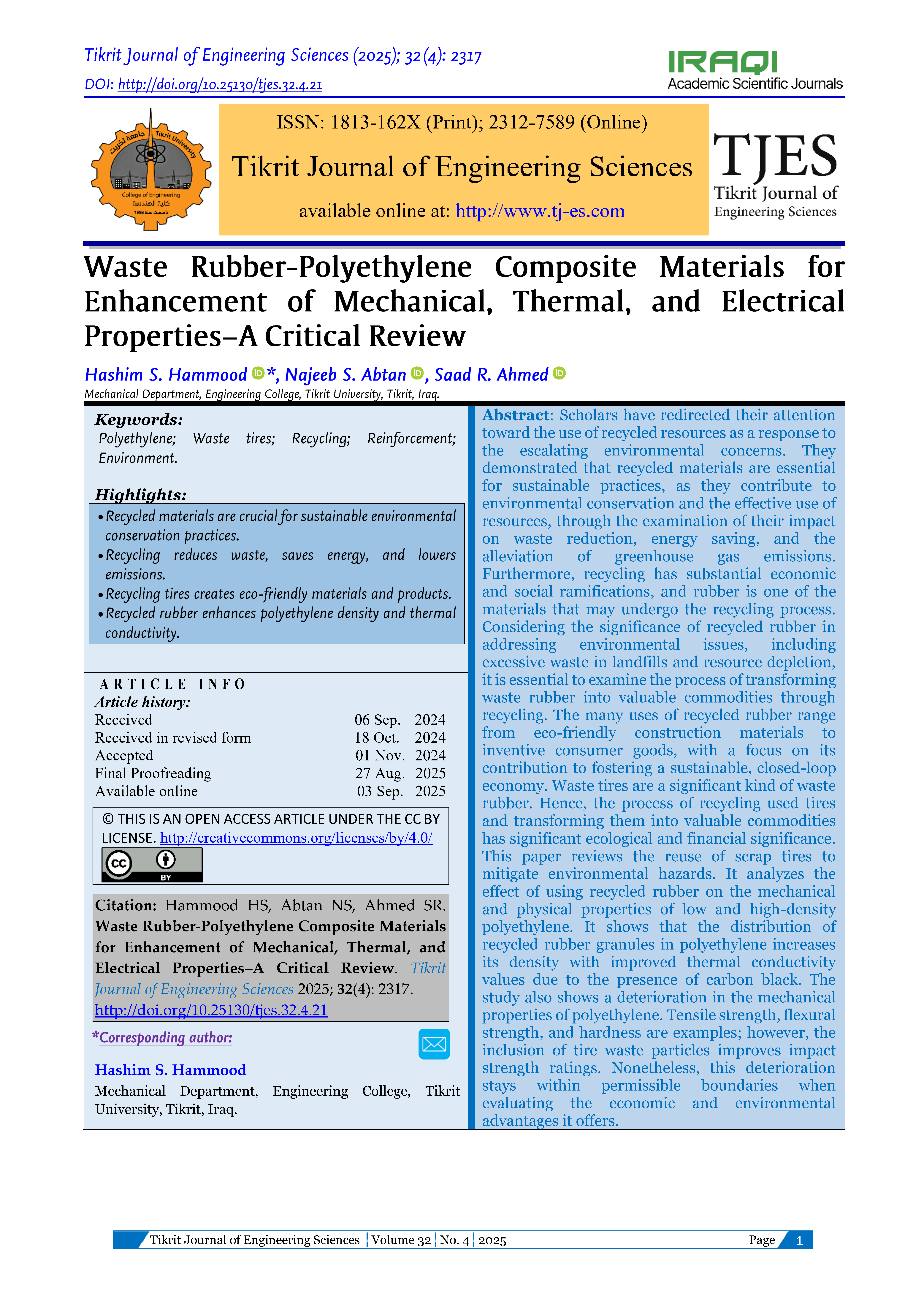 Waste Rubber-Polyethylene Composite Materials for Enhancement of Mechanical, Thermal, and Electrical Properties–A Critical Review
