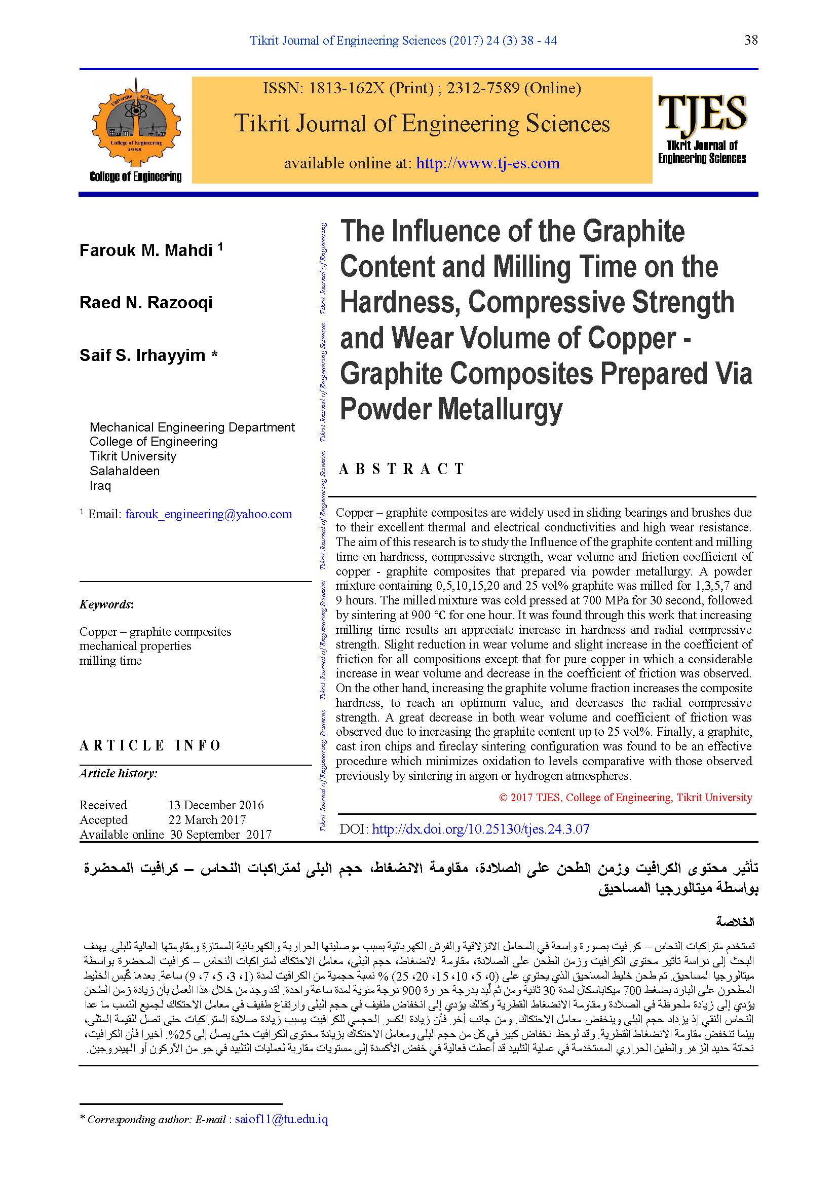 Copper – graphite composites are widely used in sliding bearings and brushes due to their excellent thermal and electrical conductivities and high wear resistance. The aim of this research is to study the Influence of the graphite content and milling time on hardness, compressive strength, wear volume and friction coefficient of copper - graphite composites that prepared via powder metallurgy. A powder mixture containing 0,5,10,15,20 and 25 vol% graphite was milled for 1,3,5,7 and 9 hours. The milled mixture was cold pressed at 700 MPa for 30 second, followed by sintering at 900 ℃ for one hour. It was found through this work that increasing milling time results an appreciate increase in hardness and radial compressive strength. Slight reduction in wear volume and slight increase in the coefficient of friction for all compositions except that for pure copper in which a considerable increase in wear volume and decrease in the coefficient of friction was observed. On the other hand, increasing the graphite volume fraction increases the composite hardness, to reach an optimum value, and decreases the radial compressive strength. A great decrease in both wear volume and coefficient of friction was observed due to increasing the graphite content up to 25 vol%. Finally, a graphite, cast iron chips and fireclay sintering configuration was found to be an effective procedure which minimizes oxidation to levels comparative with those observed previously by sintering in argon or hydrogen atmospheres.