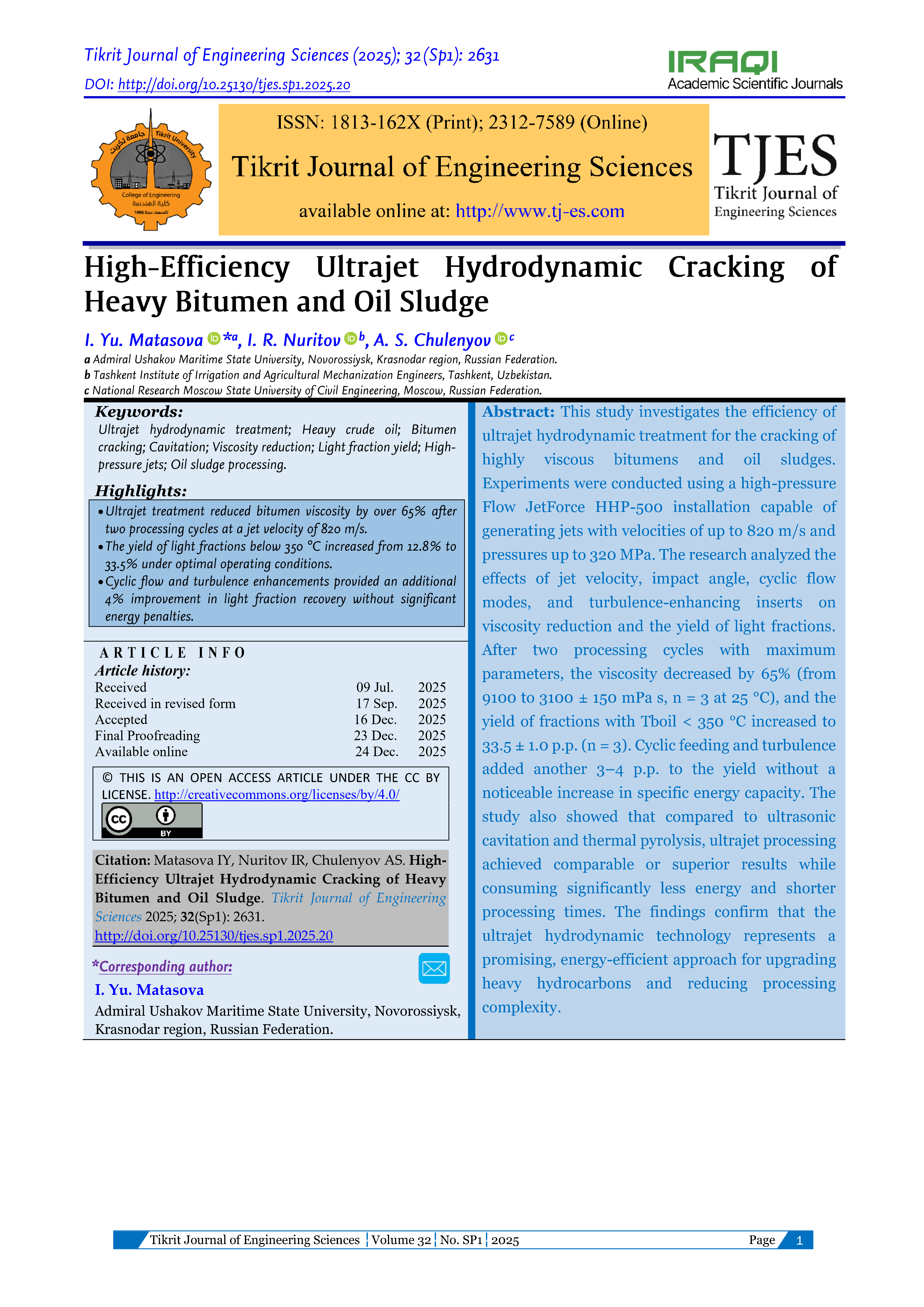 Liu H, Chen Q, Xu Q, Hu X, You Y. Experimental Study on Viscosity Reduction of Heavy Oil by Cavitating Jet with Hydrogen Donor. RSC Advances 2019; 9:12345–12356.