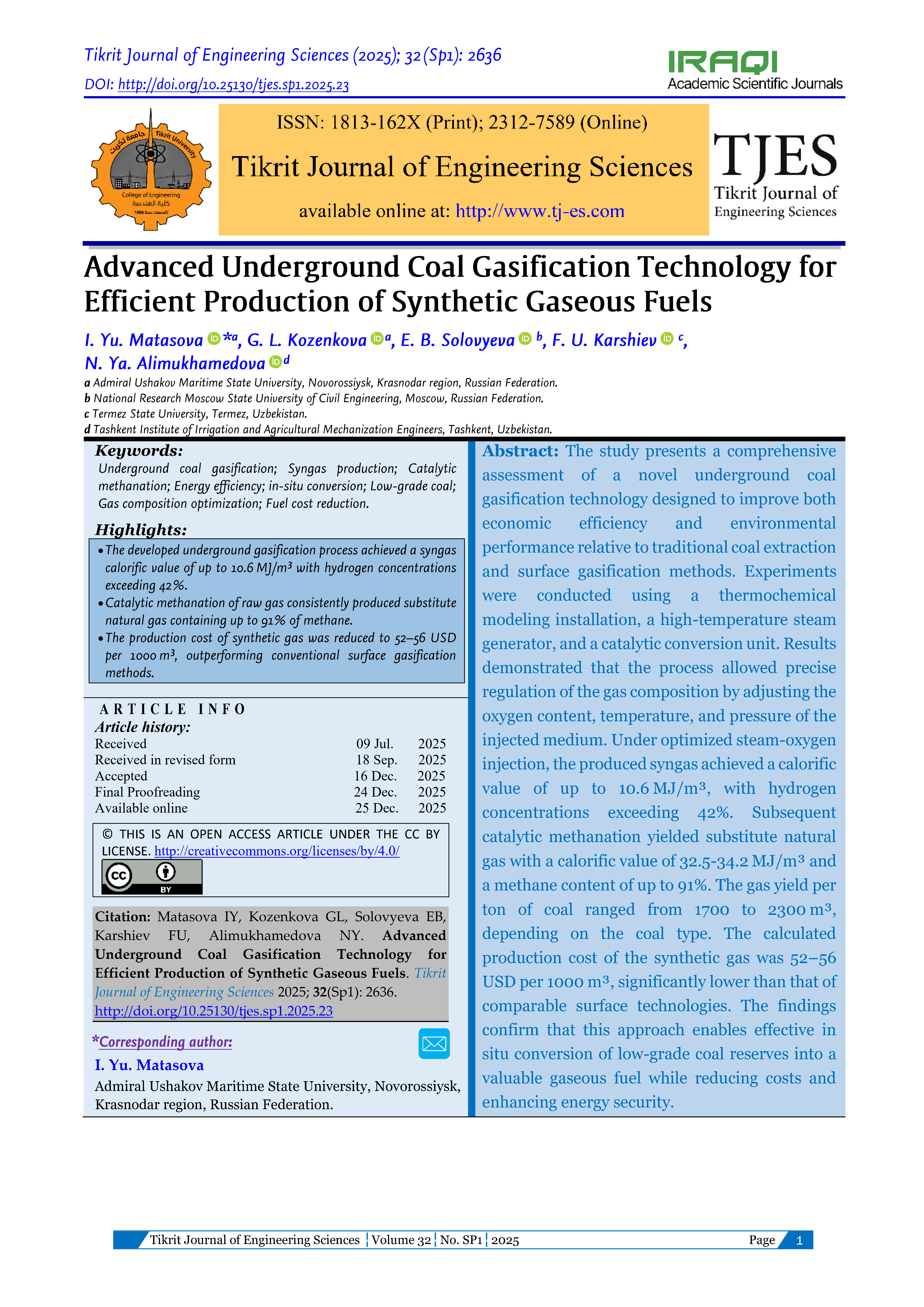 The study presents a comprehensive assessment of a novel underground coal gasification technology designed to improve both economic efficiency and environmental performance relative to traditional coal extraction and surface gasification methods. Experiments were conducted using a thermochemical modeling installation, a high-temperature steam generator, and a catalytic conversion unit. Results demonstrated that the process allowed precise regulation of the gas composition by adjusting the oxygen content, temperature, and pressure of the injected medium. Under optimized steam-oxygen injection, the produced syngas achieved a calorific value of up to 10.6 MJ/m³, with hydrogen concentrations exceeding 42%. Subsequent catalytic methanation yielded substitute natural gas with a calorific value of 32.5-34.2 MJ/m³ and a methane content of up to 91%. The gas yield per ton of coal ranged from 1700 to 2300 m³, depending on the coal type. The calculated production cost of the synthetic gas was 52–56 USD per 1000 m³, significantly lower than that of comparable surface technologies. The findings confirm that this approach enables effective in situ conversion of low-grade coal reserves into a valuable gaseous fuel while reducing costs and enhancing energy security.