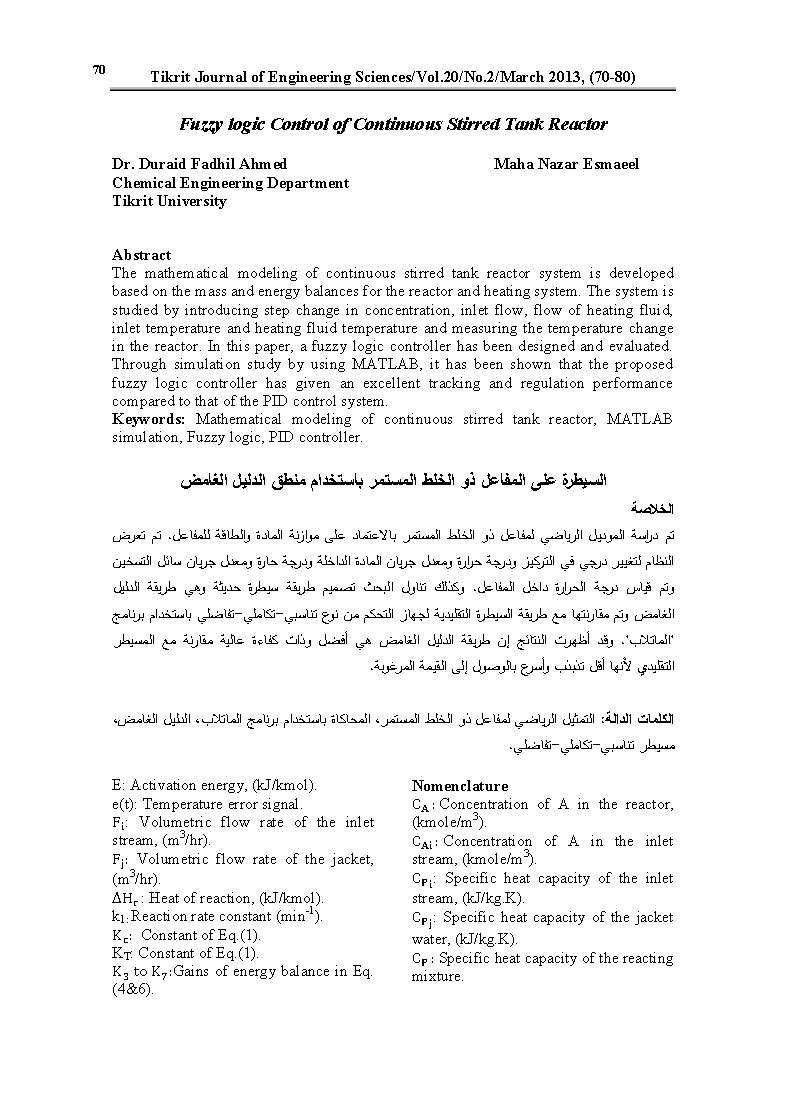 Salehia S., Mohammad Shahrokhi,” Adaptive Fuzzy Approach For H∞ Temperature Tracking Control of Continuous Stirred Tank Reactors”, Control Engineering Practice, Vol.16, pp. 1101–1108, (2008). DOI: https://doi.org/10.1016/j.conengprac.2007.12.005