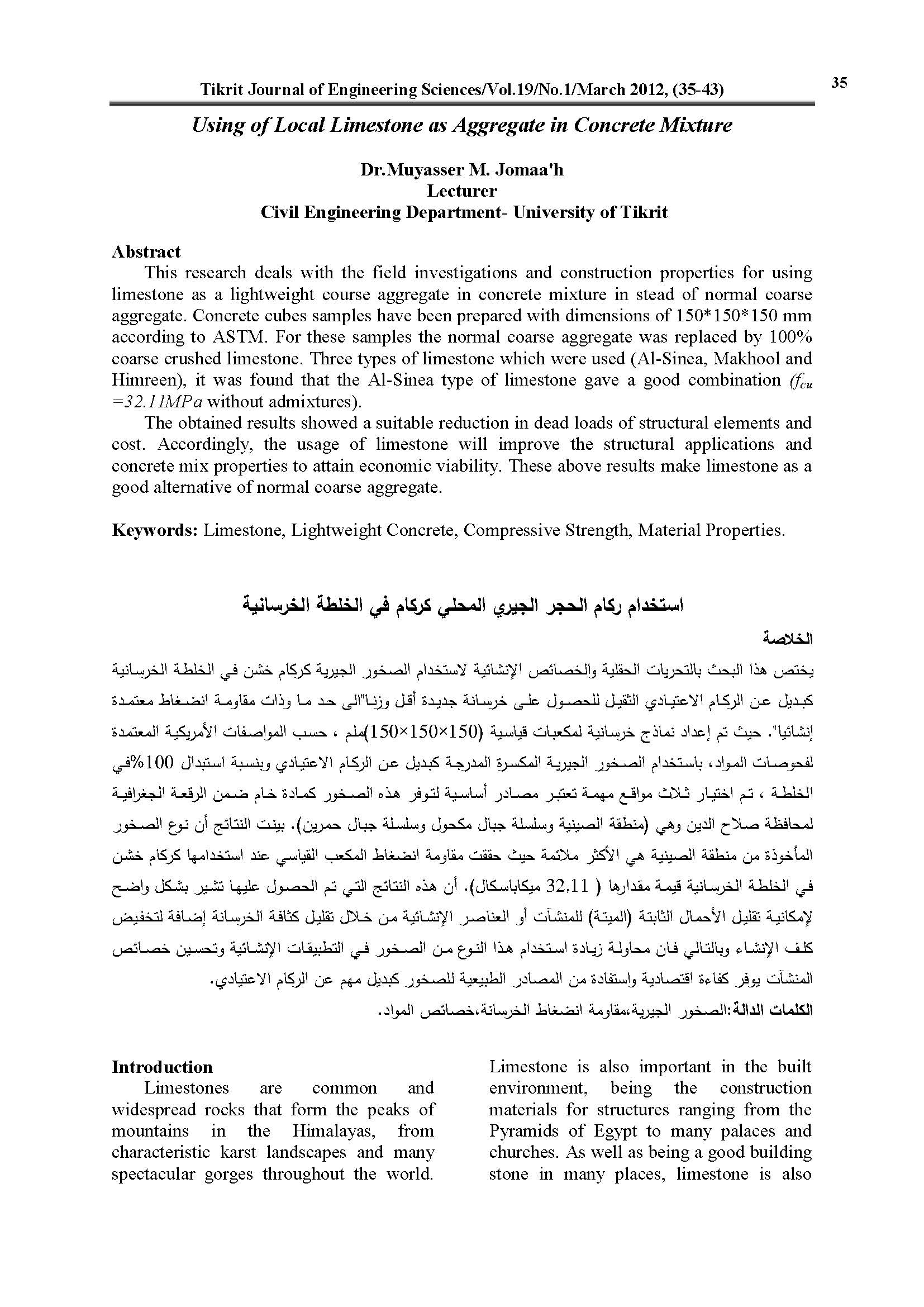 The obtained results showed a suitable reduction in dead loads of structural elements and cost. Accordingly, the usage of limestone will improve the structural applications and concrete mix properties to attain economic viability. These above results make limestone as a good alternative of normal coarse aggregate.