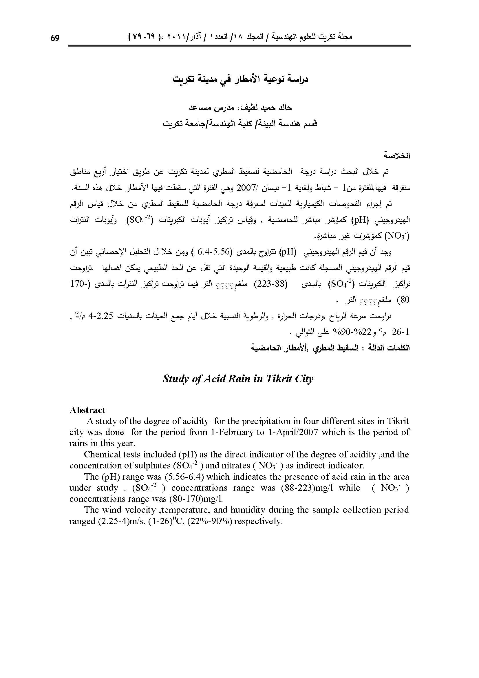 A study of the degree of acidity for the precipitation in four different sites in Tikrit city was done for the period from 1-February to 1-April/2007 which is the period of rains in this year.