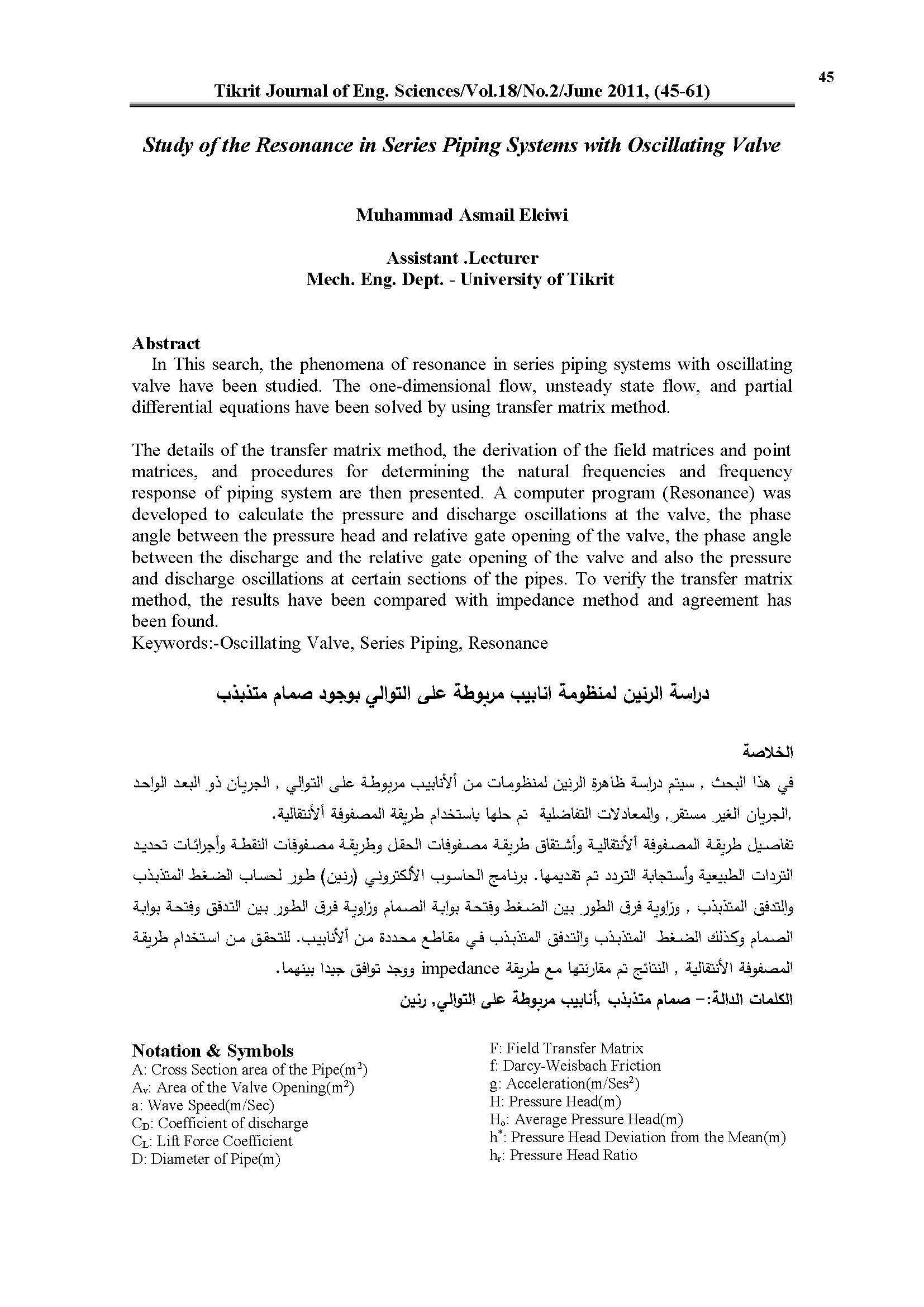 The details of the transfer matrix method, the derivation of the field matrices and point matrices, and procedures for determining the natural frequencies and frequency response of piping system are then presented. A computer program (Resonance) was developed to calculate the pressure and discharge oscillations at the valve, the phase angle between the pressure head and relative gate opening of the valve, the phase angle between the discharge and the relative gate opening of the valve and the pressure and discharge oscillations at certain sections of the pipes. To verify the transfer matrix method, the results have been compared with impedance method and agreement has been found.