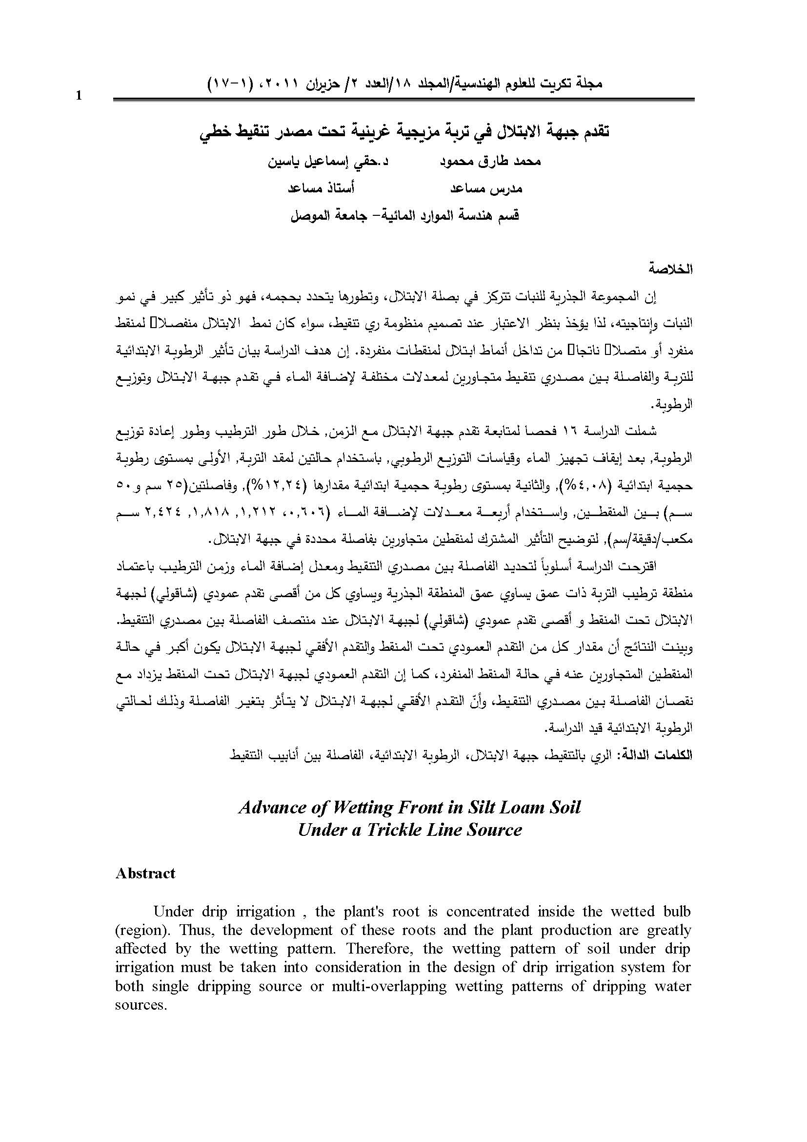 محمود، محمدطارق (۲۰۰۹)، " تقدم جبهة الابتلال وتوزيع الرطوبة في تربة مزيجية غرينية تحت مصدر تنقيط خطي "، رسالة ماجستير، قسم هندسة الموارد المائية، جامعة الموصل، العراق.