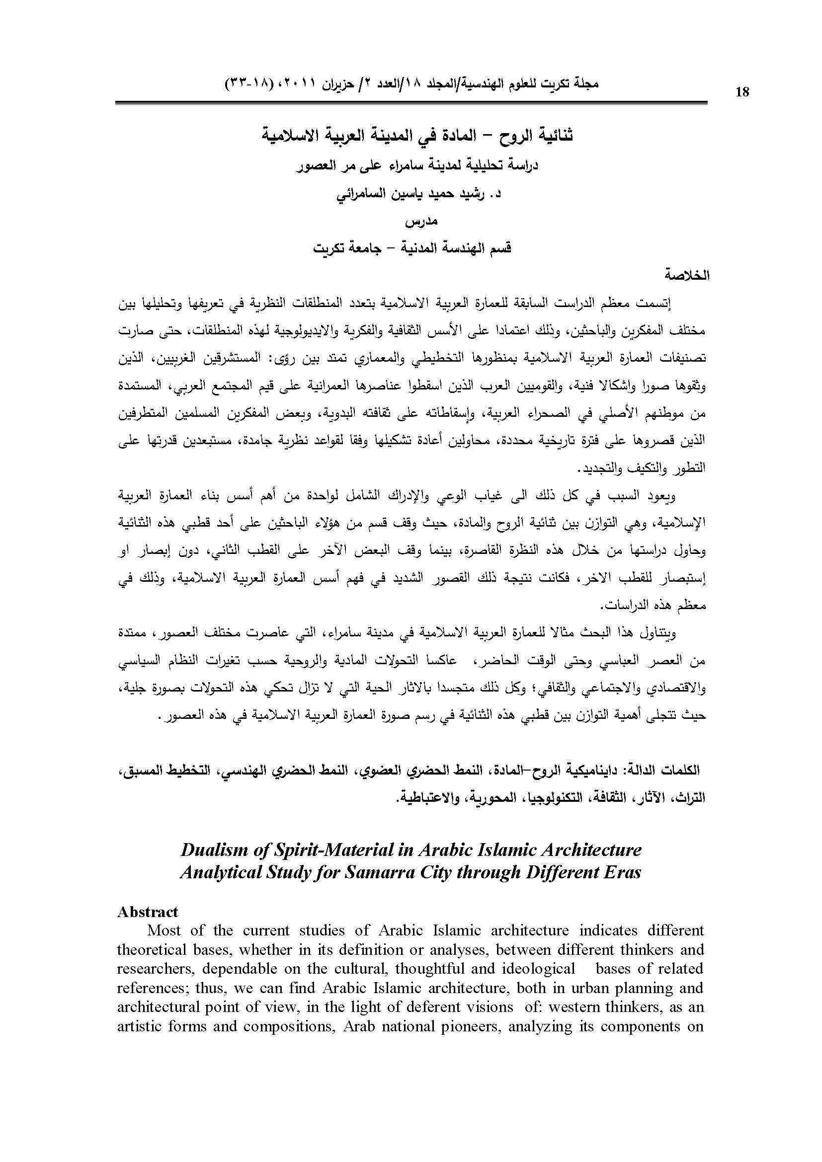 Dualism of Spirit-Material in Arabic Islamic Architecture Analytical Study for Samarra City through different Eras