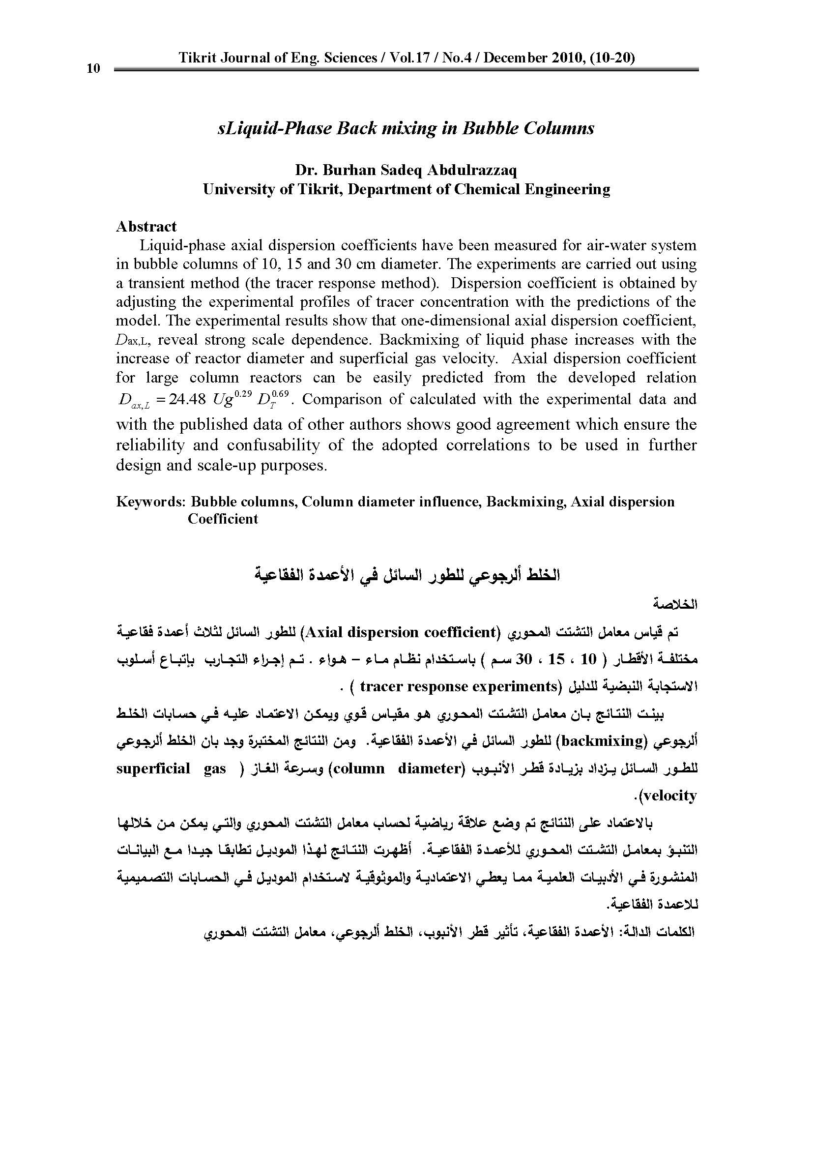 Liquid-phase axial dispersion coefficients have been measured for air-water system in bubble columns of 10, 15 and 30 cm diameter. The experiments are carried out using a transient method (the tracer response method).  Dispersion coefficient is obtained by adjusting the experimental profiles of tracer concentration with the predictions of the model. The experimental results show that one-dimensional axial dispersion coefficient, Dax,L, reveal strong scale dependence. Backmixing of liquid phase increases with the increase of reactor diameter and superficial gas velocity.  Axial dispersion coefficient for large column reactors can be easily predicted from the developed relation . Comparison of calculated with the experimental data and with the published data of other authors shows good agreement which ensure the reliability and confusability of the adopted correlations to be used in further design and scale-up purposes.