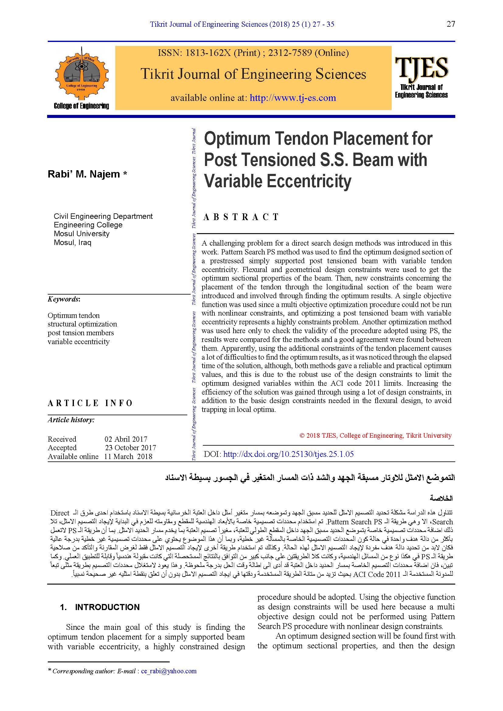 A challenging problem for a direct search design methods was introduced in this work. Pattern Search PS method was used to find the optimum designed section of a prestressed simply supported post tensioned beam with variable tendon eccentricity. Flexural and geometrical design constraints were used to get the optimum sectional properties of the beam. Then, new constraints concerning the placement of the tendon through the longitudinal section of the beam were introduced and involved through finding the optimum results. A single objective function was used since a multi objective optimization procedure could not be run with nonlinear constraints, and optimizing a post tensioned beam with variable eccentricity represents a highly constraints problem. Another optimization method was used here only to check the validity of the procedure adopted using PS, the results were compared for the methods and a good agreement were found between them. Apparently, using the additional constraints of the tendon placement causes a lot of difficulties to find the optimum results, as it was noticed through the elapsed time of the solution, although, both methods gave a reliable and practical optimum values, and this is due to the robust use of the design constraints to limit the optimum designed variables within the ACI code 2011 limits. Increasing the efficiency of the solution was gained through using a lot of design constraints, in addition to the basic design constraints needed in the flexural design, to avoid trapping in local optima.
