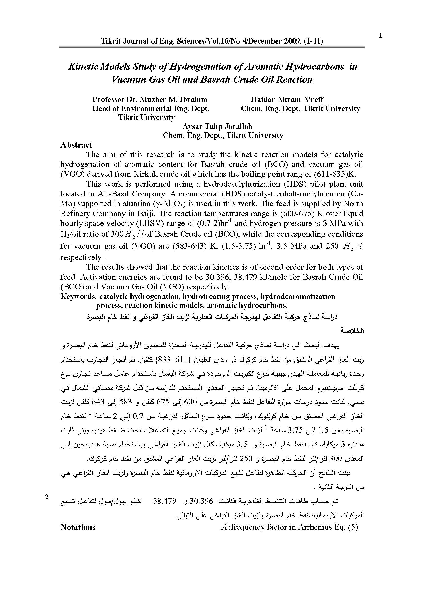 A,reff H. A.(( The effect operating conditions on vacuum gas oil hydrotreating on sulfur and aromatic content )), M.SC. Thesis University of Tikrit, College of Engineering , Chem. Eng. Department (2001) .