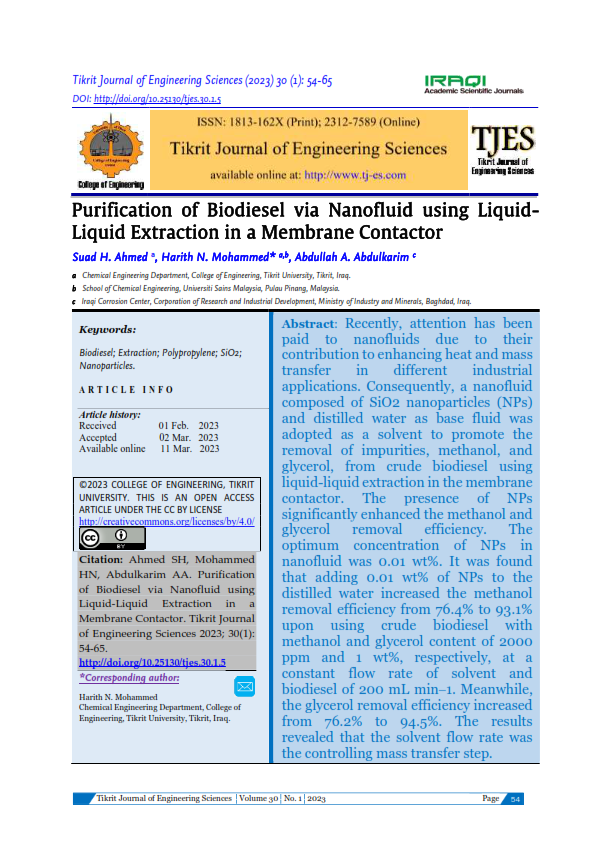 Recently, attention has been paid to nanofluids due to their contribution to enhancing heat and mass transfer in different industrial applications. Consequently, a nanofluid composed of SiO2 nanoparticles (NPs) and distilled water as base fluid was adopted as a solvent to promote the removal of impurities, methanol, and glycerol, from crude biodiesel using liquid-liquid extraction in the membrane contactor. The presence of NPs significantly enhanced the methanol and glycerol removal efficiency. The optimum concentration of NPs in nanofluid was 0.01 wt%. It was found that adding 0.01 wt% of NPs to the distilled water increased the methanol removal efficiency from 76.4% to 93.1% upon using crude biodiesel with methanol and glycerol content of 2000 ppm and 1 wt%, respectively, at a constant flow rate of solvent and biodiesel of 200 mL min⎼1. Meanwhile, the glycerol removal efficiency increased from 76.2% to 94.5%. The results revealed that the solvent flow rate was the controlling mass transfer step.