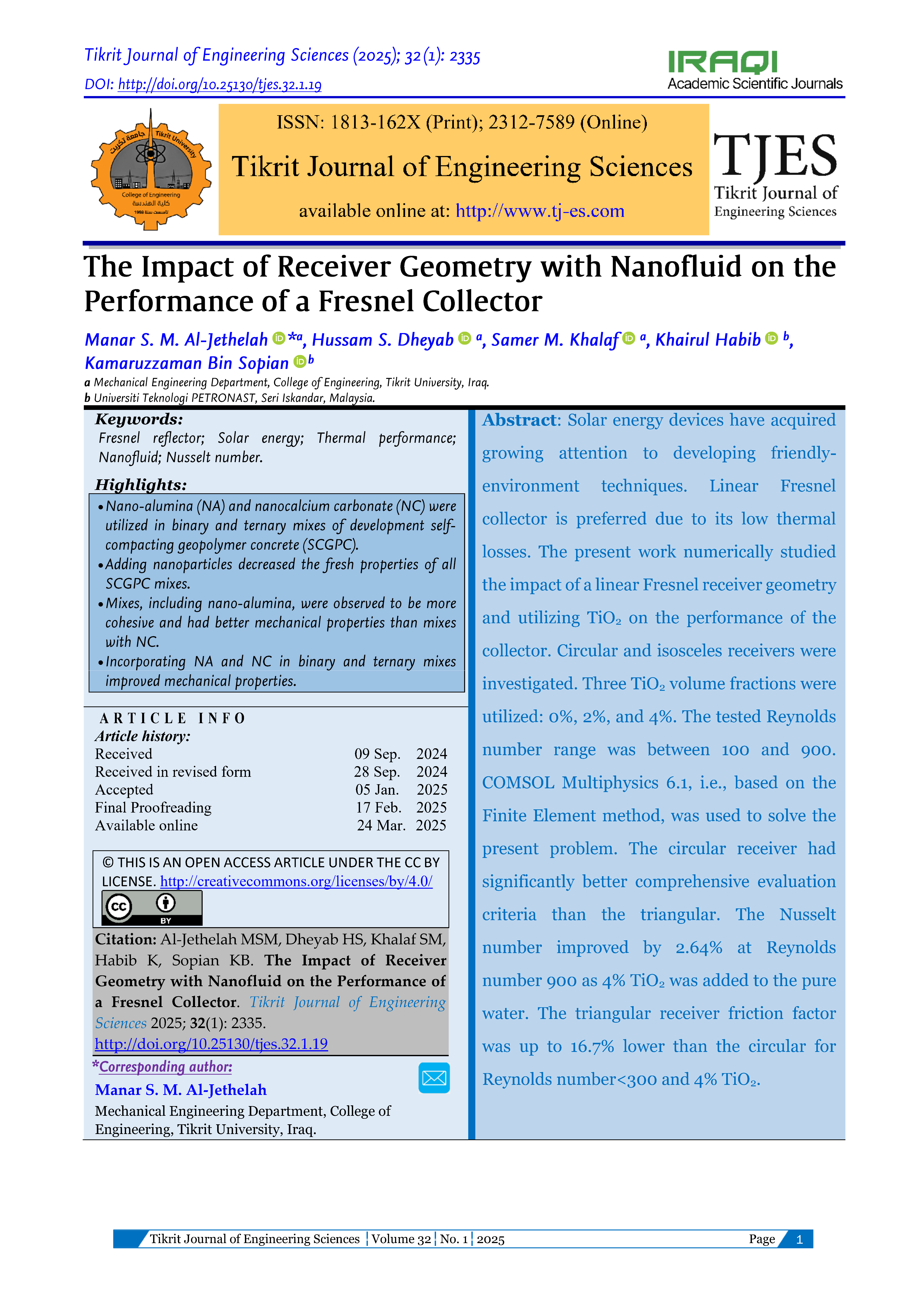 • The Impact of Receiver Geometry with Nanofluid on the Performance of a Fresnel Collector