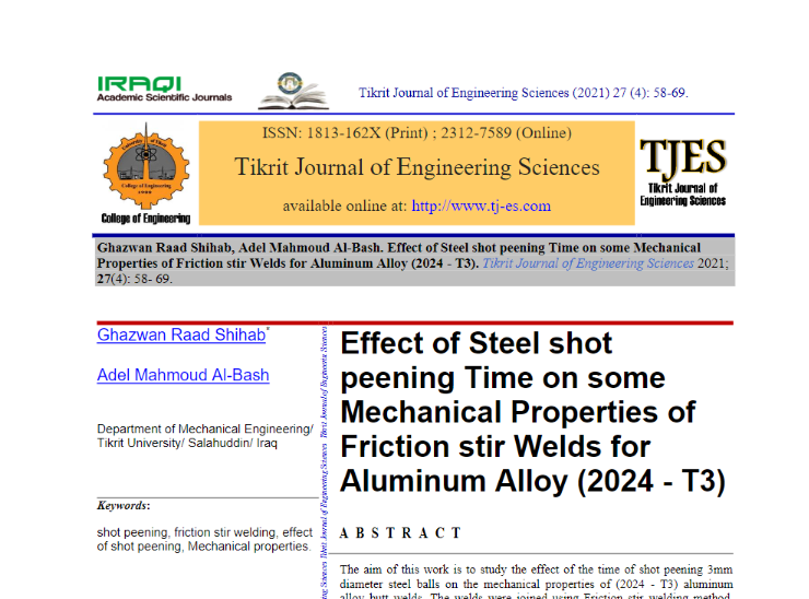 Effect of Steel shot peening Time on some Mechanical Properties of Friction stir Welds for Aluminum Alloy (2024 - T3)